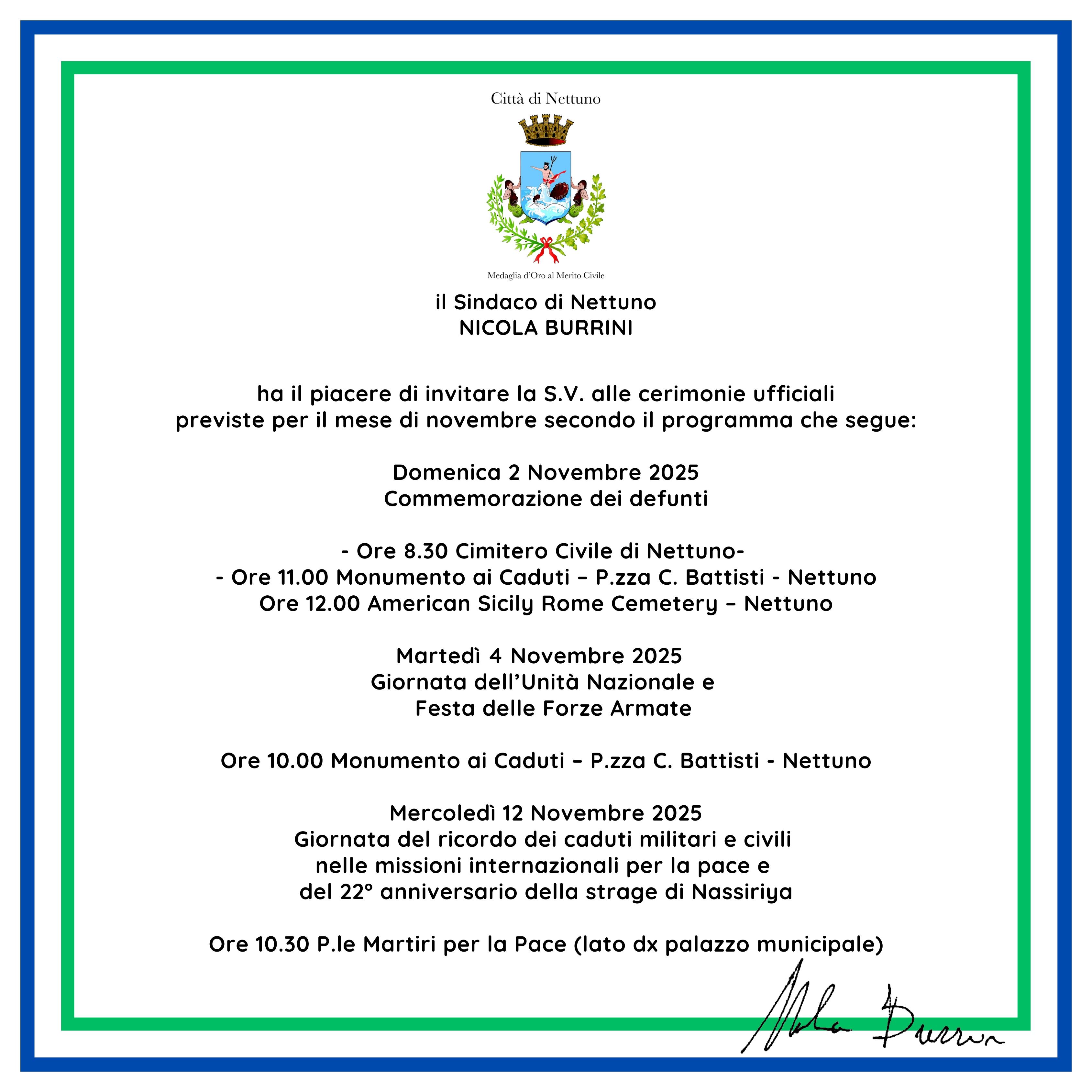 Il Sindaco di Nettuno Nicola Burrini invita i cittadini a partecipare al programma di iniziative organizzate dal Comune di Nettuno per la commemorazione dei defunti, per la giornata dell’Unità nazionale, la festa delle Forze armate e il ricordo della strage di Nassiriya.