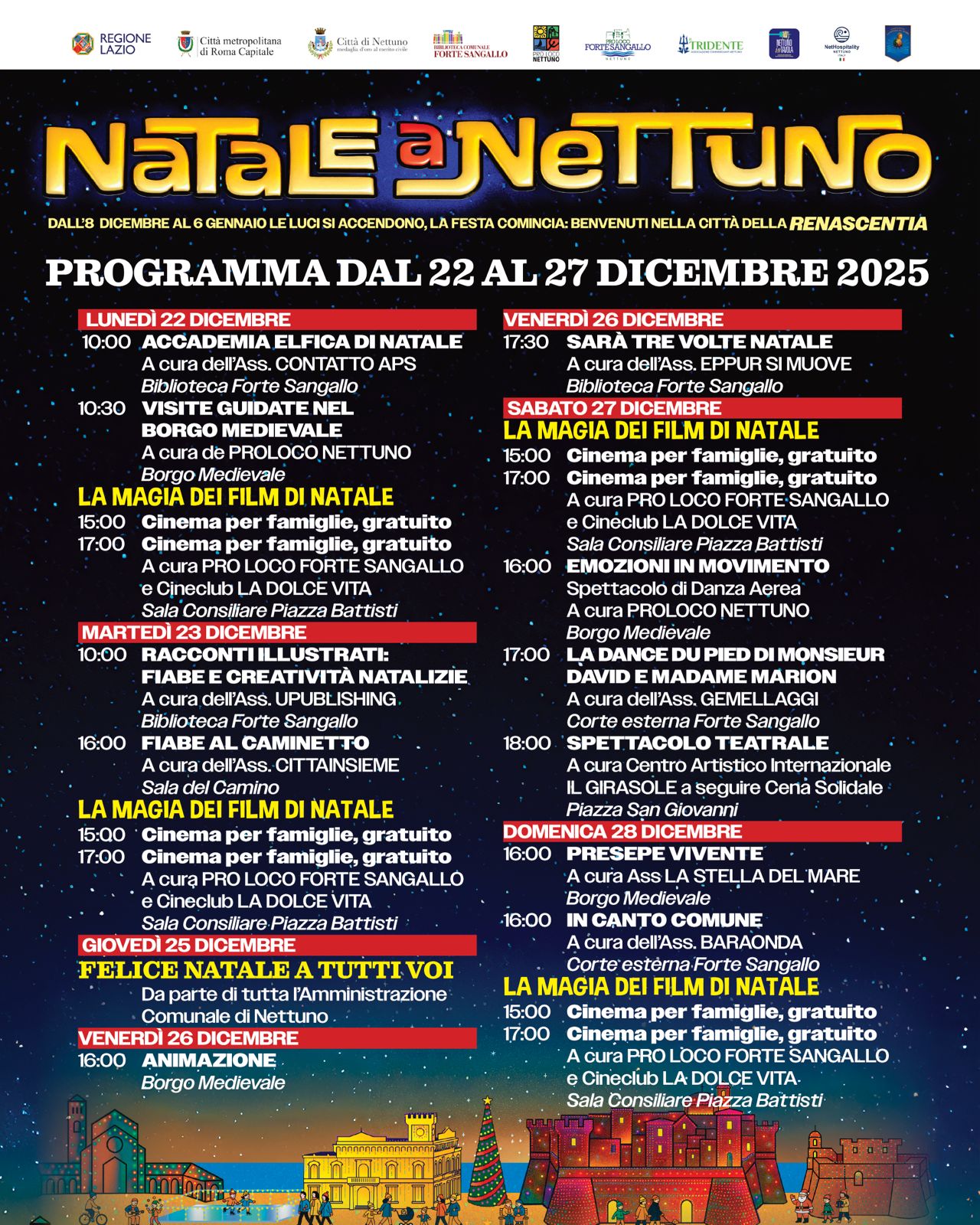 Immancabile per domenica 14 e domenica 28 dicembre la rappresentazione del Presepe vivente al Borgo medievale, a cura dell’Associazione La Stella del mare, le fiabe di Calvino al Forte Sangallo, il 12 il concerto della Corale, lunedì 15 ci saranno i Canti di Natale dei bambini nella sala consiliare, martedì 16 appuntamento con il Natale inclusivo dei Liberi Teatranti, non mancherà la Magia dei film di Natale per bimbi e famiglie in sala consiliare da domenica 21 a domenica 28 dicembre.