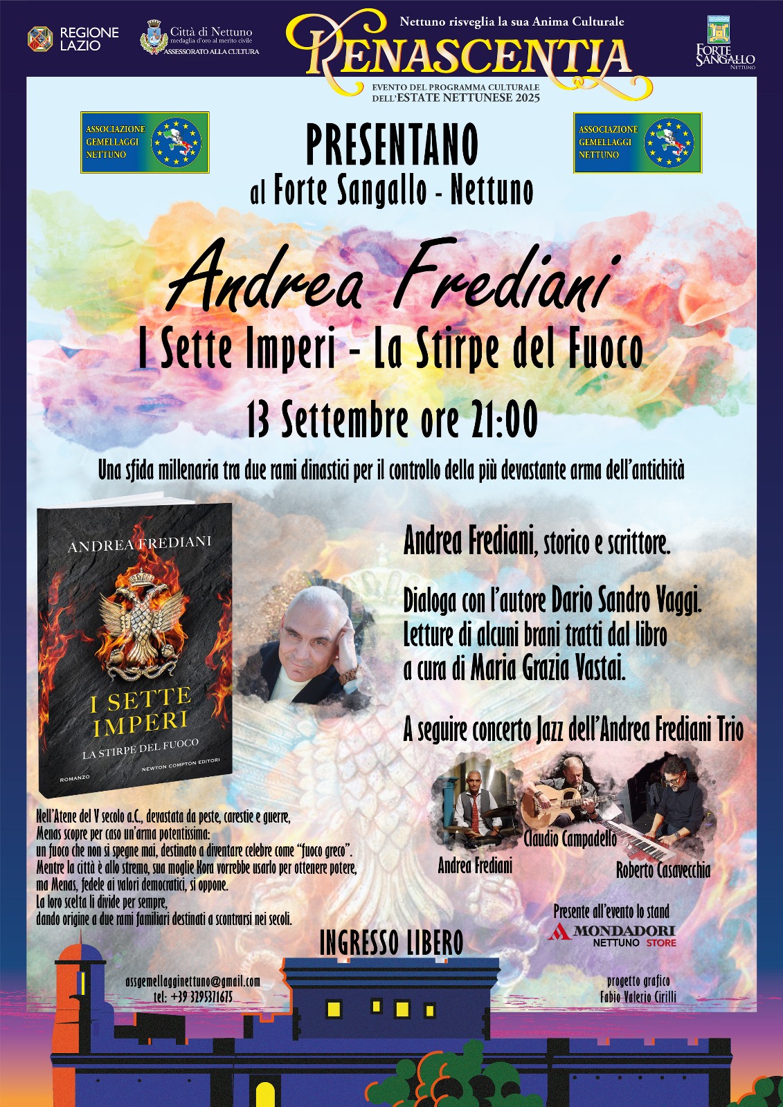 L’Associazione Gemellaggi Nettuno sabato 13 settembre, alle 21 presso il Forte Sangallo, con il patrocinio del comune di Nettuno presenta, in anteprima nazionale, il libro di Andrea Frediani “I sette imperi. La stirpe del fuoco” in uscita il 9 settembre.